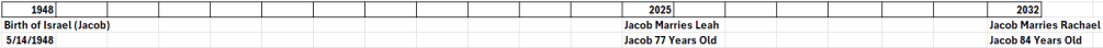 From the birth of Israel, to the marriage of Leah (Likely the Church) is 77 years or 2025. Rachael (Israel) will be saved/married at the end of the 7 year tribulation at 84 years in the year 2032!